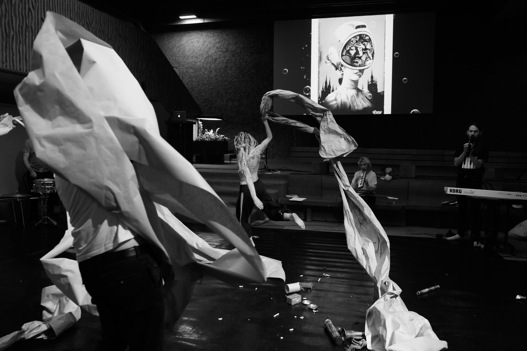 В процессе действия будет звучать живая импровизационная музыка, а зритель сможет примерить на себя разные роли, музыканта экспериментатора, танц-художника, перформера, а также познакомиться с известными высказываниями о современном искусстве и заявить свой манифест.